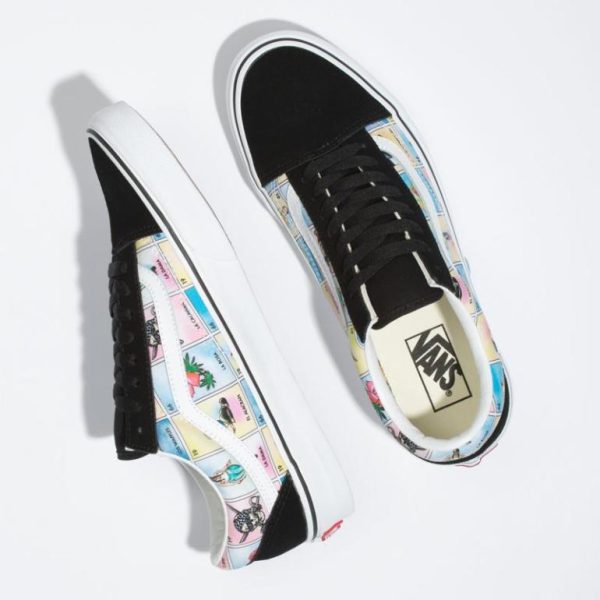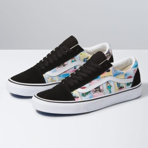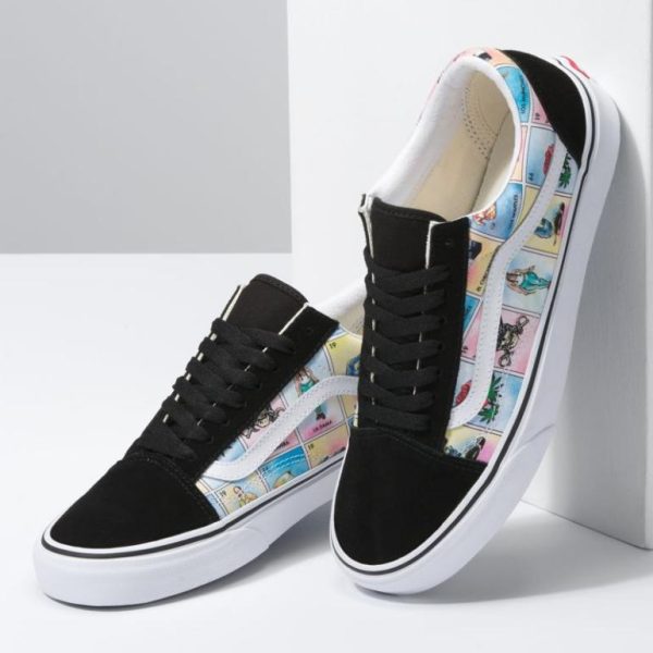 The Los Vans Old Skool, the Vans classic skate shoe and first to bare the iconic sidestripe, is a low top lace-up featuring printed textile and suede uppers, re-enforced toecaps to withstand repeated wear, padded collars for support and flexibility, and signature rubber waffle outsoles.