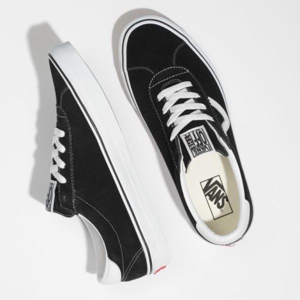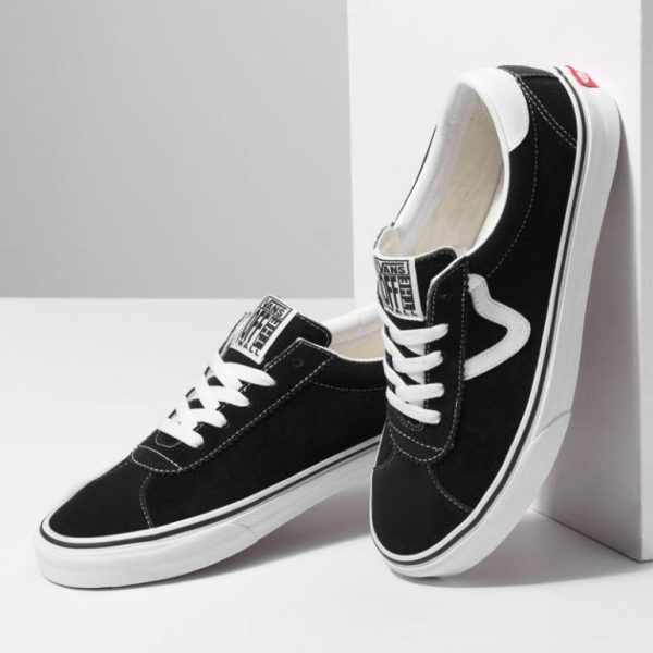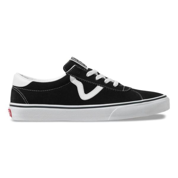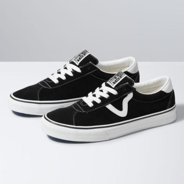 The Suede Vans Sport is a retro lace-up style featuring sturdy suede uppers, heel details, old school V side stripes, and signature rubber waffle outsoles.