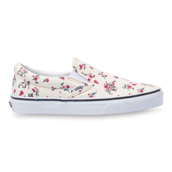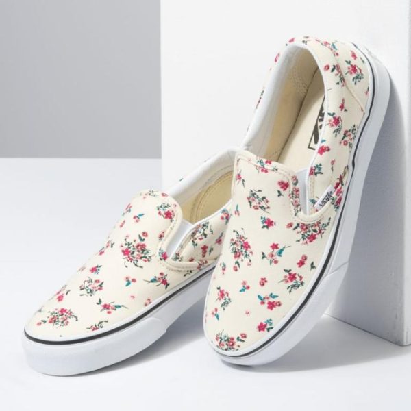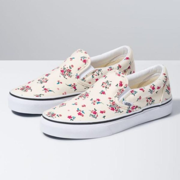 The Ditsy Floral Classic Slip-On features sturdy low profile slip-on canvas uppers with an allover floral print, padded collars, elastic side accents, and signature rubber waffle outsoles.