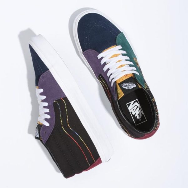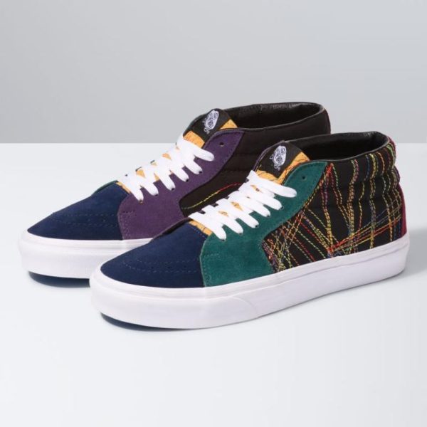The Frenzy Sk8-Mid, a mid-top silhouette inspired by the iconic Sk8-Hi, features sturdy canvas and suede uppers with decorative rainbow ombre stitching, padded collars for support and flexibility, reinforced toe caps to withstand repeated wear, and signature rubber waffle outsoles.