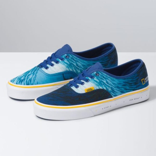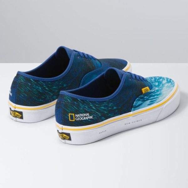 Vans and National Geographic come together for a collection of footwear and apparel that celebrates over 130 years of the never-ending quest to explore our planet. Honoring National Geographic’s longstanding tradition of seeking and storytelling, the Vans X National Geographic Authentic combines the original and now iconic Vans low top style with organic cotton canvas uppers, an ocean photograph taken from the National Geographic archives, metal eyelets, and signature rubber waffle outsoles.