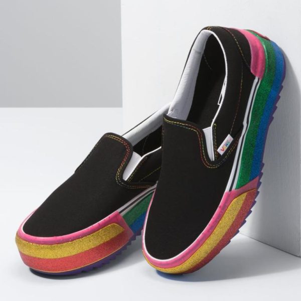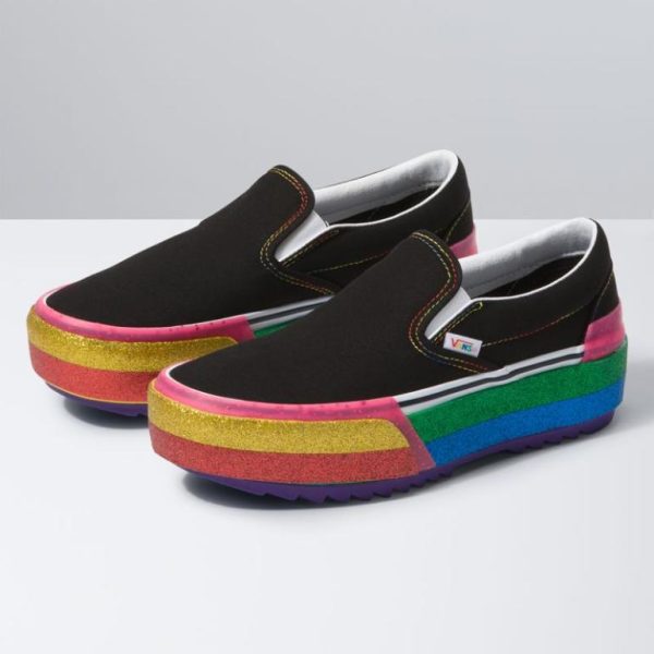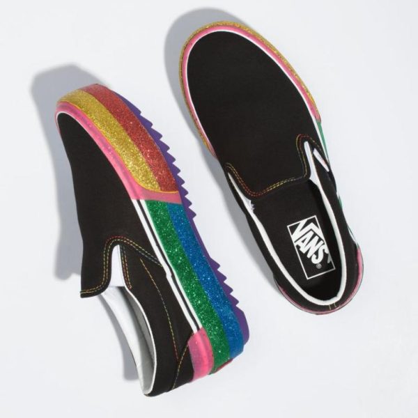 The Glitter Classic Slip-On Stacked takes the iconic Vans silhouette to an elevated level. Made with sturdy canvas uppers and rainbow glitter details, the Glitter Classic Slip-On Stacked also includes oversized features and layers like platform bumpers, exaggerated outsoles, and translucent foxing tape.