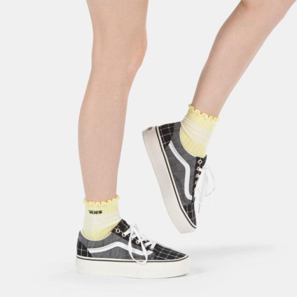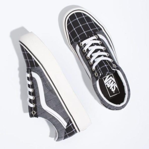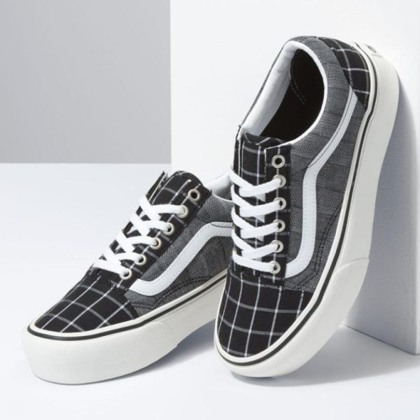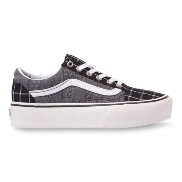 The Woven Check Old Skool Platform combines the classic Vans sidestripe skate shoe with woven textile uppers, platform sidewalls, padded collars for support and flexibility, and signature rubber waffle outsoles.