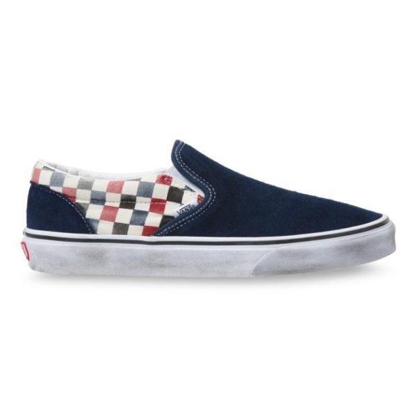 The Washed Classic Slip-On combines durable low-profile suede and washed canvas uppers with the legendary Vans checkerboard print, featuring comfortable padded collars, flexible elastic side accents, and the signature grippy rubber waffle outsoles for superior traction.