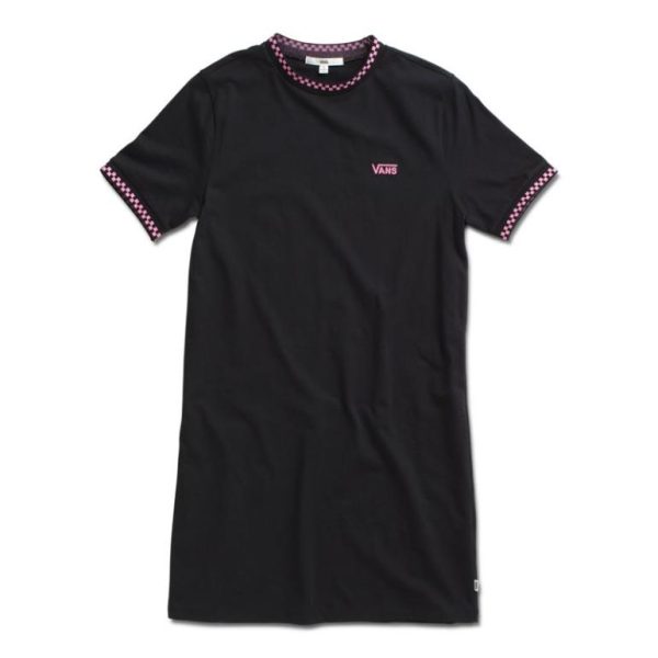 The All Stakes Dress is a 100% cotton short sleeve t-shirt dress with jacquard flat knit ribbing at the neck, sleeve cuffs, and chest logo embroidery. Model is 5 feet 9 inches tall and wearing a size Small.
