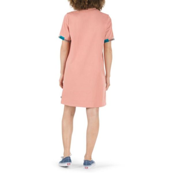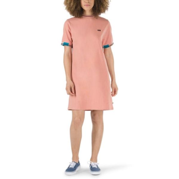 The Hi Roller Tri Check Dress is a 100% cotton t-shirt dress with short cuffed sleeves, a jacquard flat knit rib neck, and logo embroidery at the chest. Model is 5 feet 9 inches tall and wearing a size Small.