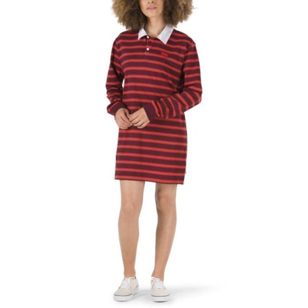 The Studio Polo Dress is a 58% cotton, 38% polyester, and 4% elastane rib knit body-skimming polo dress with short sleeves, a zip neck, checkerboard taping at the back neck, and logo embroidery at the chest. Model is 5 feet 9 inches tall and wearing a size Small.