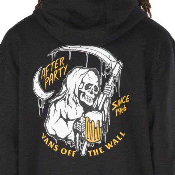 The After Party Pullover Hoodie is a 60% cotton, 40% polyester fleece pullover hooded sweatshirt with a front pouch pocket and skull graphics at the left chest and back. Model is 6 feet tall and wearing a size Medium.