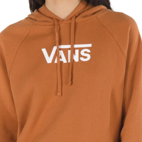 The Flying V FT Boxy Hoodie is an 84% cotton, 16% polyester French terry pullover hooded sweatshirt with raglan sleeves, classic front logo graphics, and a boxy fit. Model is 5 feet 9 inches tall and wearing a size Small.