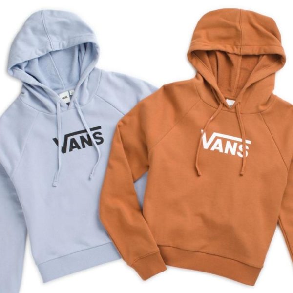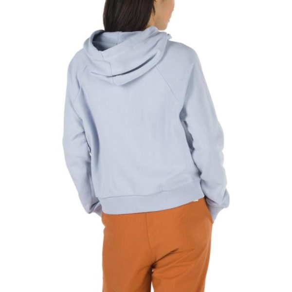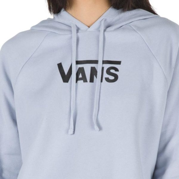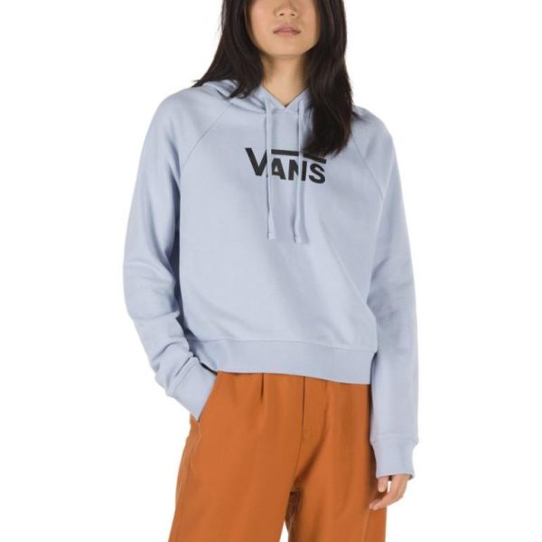 The Flying V FT Boxy Hoodie is an 84% cotton, 16% polyester French terry pullover hooded sweatshirt with raglan sleeves, classic front logo graphics, and a boxy fit. Model is 5 feet 9 inches tall and wearing a size Small.