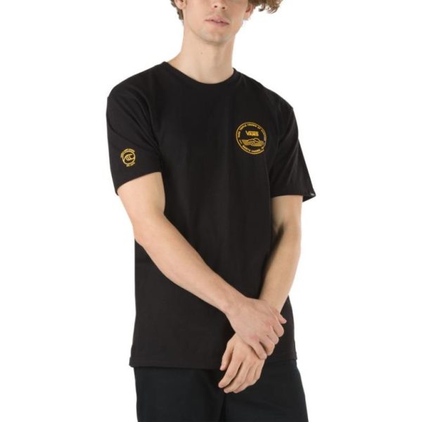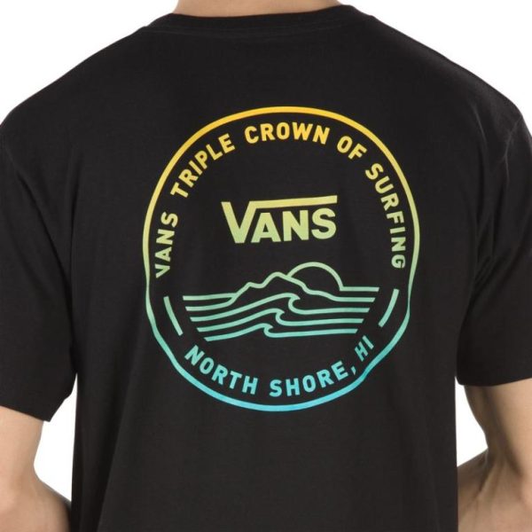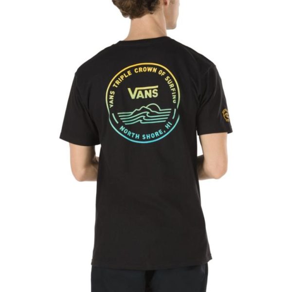 The 2020 VTCS Lockup Short Sleeve T-Shirt features premium 100% carded ringspun cotton construction with bold 2020 Vans Triple Crown of Surfing graphics displayed at the left chest, back, and right sleeve. Designed for ultimate comfort and authentic surf style. Model is 6 feet tall and wearing a size Medium.