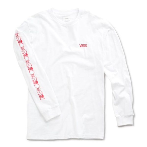The Anaheim Factory OG Skull Long Sleeve T-Shirt features premium 100% carded ringspun cotton construction with striking skull graphics positioned at the left chest and sleeve. Model is 6 feet tall and wearing a size Medium.