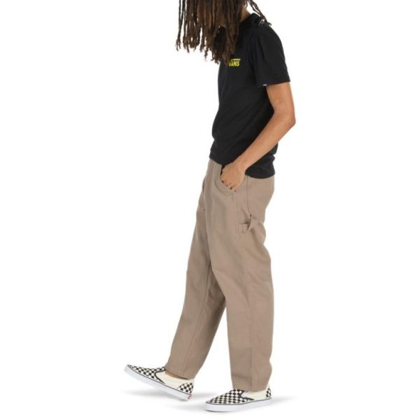 The Municiple Pant is a 100% BCI Cotton 8 oz. rigid nailhead canvas carpenter pant with an elastic waist and a loose, roomy fit. Model is 6 feet tall and wearing a size Medium.