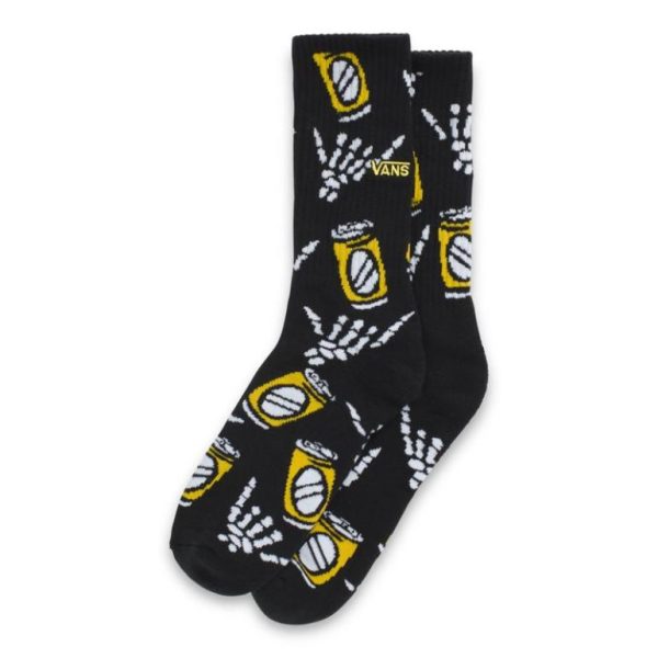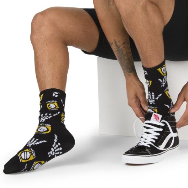 The Gate Crasher Crew Sock is a 52% cotton, 36% nylon, 7% polyester, 4% elastodiene, and 1% elastane crew sock with skeleton jacquard art and an embroidered Vans logo.