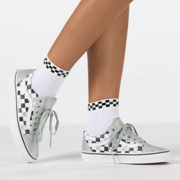The Peek-A-Check Crew Sock is a 66% cotton, 31% nylon, 2% rubber, and 1% elastane low-height crew sock with wide ribbing and jacquard details.