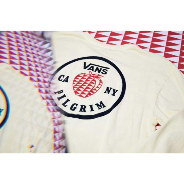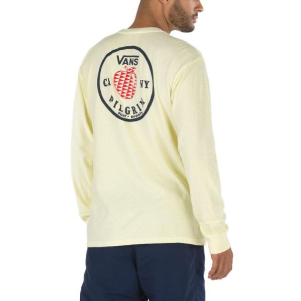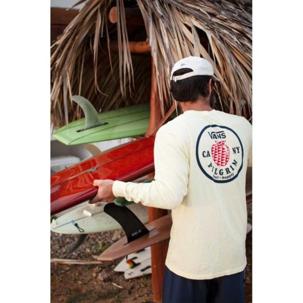 Hailing from the southeastern tip of Rhode Island, Pilgrim Surf + Supply was founded by Mr. Chris Gentile, a purist with a passion for marrying surf and outdoor inspired style with a casual and utilitarian aesthetic. His goal for the Brooklyn-based label was to create a social hub where the community could discover new things, share their ideas, and interact with the various aspects of culture that had shaped his life. Embodying these ideals, the Vans X Pilgrim Surf + Supply Apples Long Sleeve T-Shirt features an overdye and custom collaboration graphics on the left chest and back. Model is 6 feet tall and wearing a size Medium.