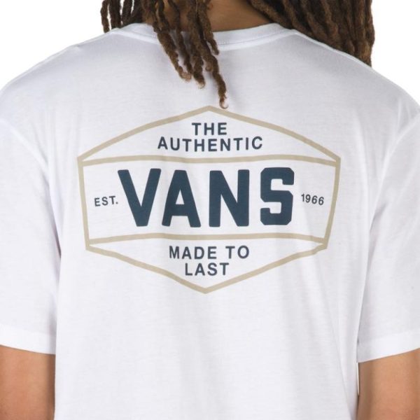 The Vans Standard Short Sleeve T-Shirt is a 100% combed ringspun cotton t-shirt with graphics at the left chest and back. Fit type: slim. Model is 6 feet tall and wearing a size Medium.