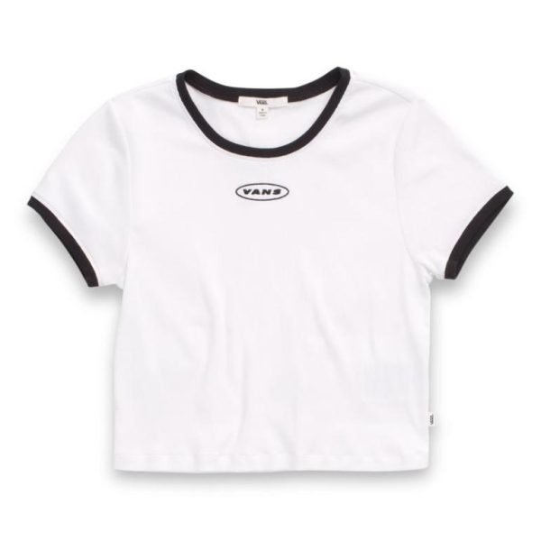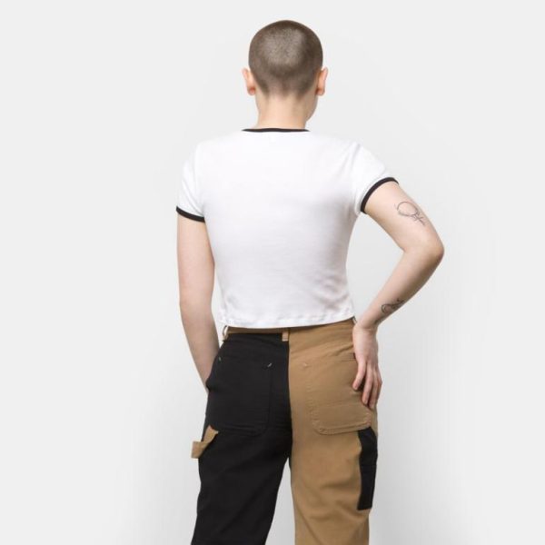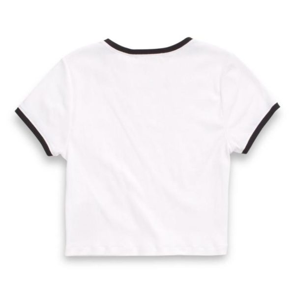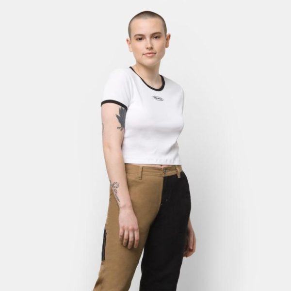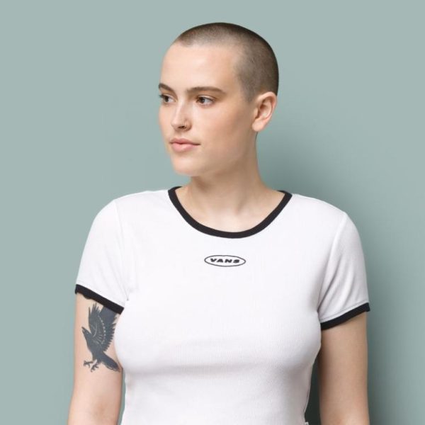 The Grunge Glam Baby T-Shirt is a 100% cotton ribbed baby tee with a scoop neck, contrast binding at the neck, and logo embroidery at the chest. Model is 5 feet 9 inches tall and wearing a size Small.